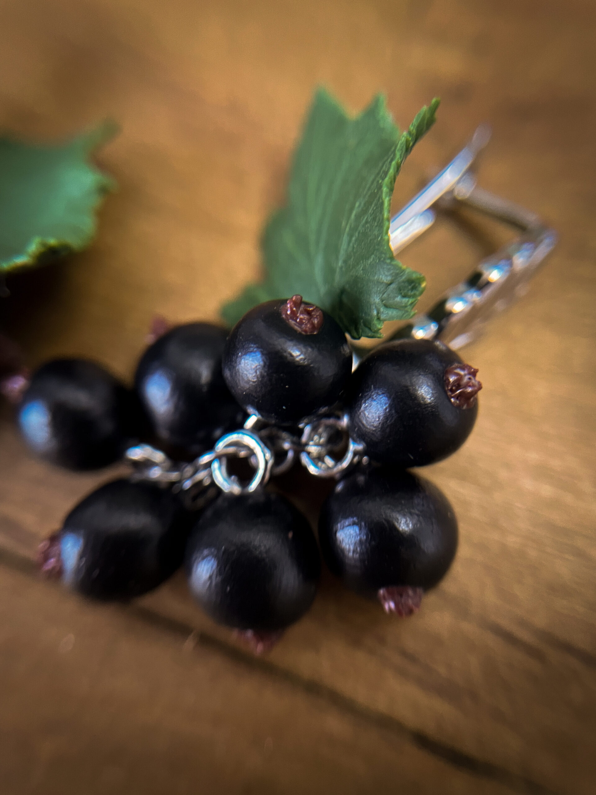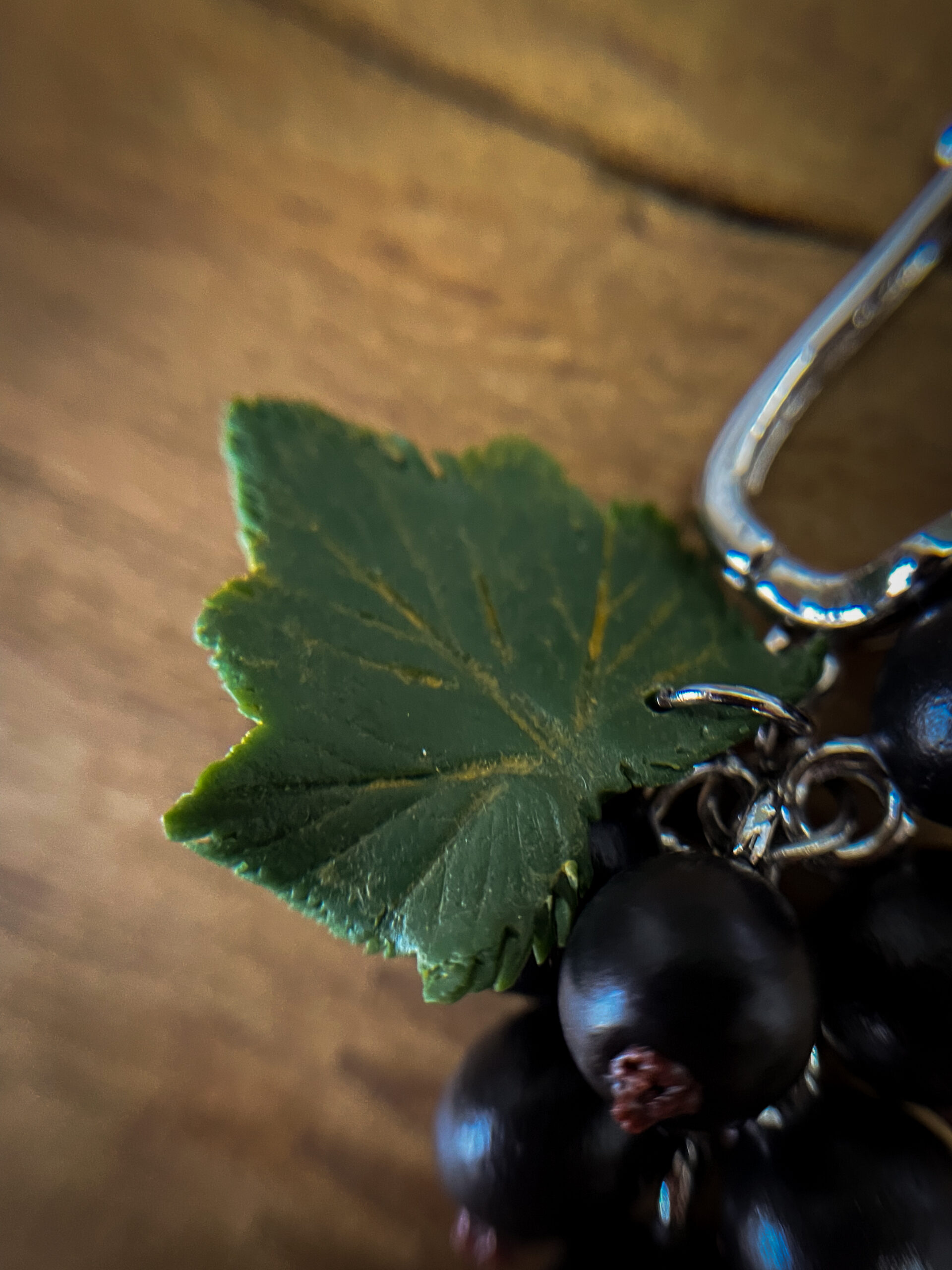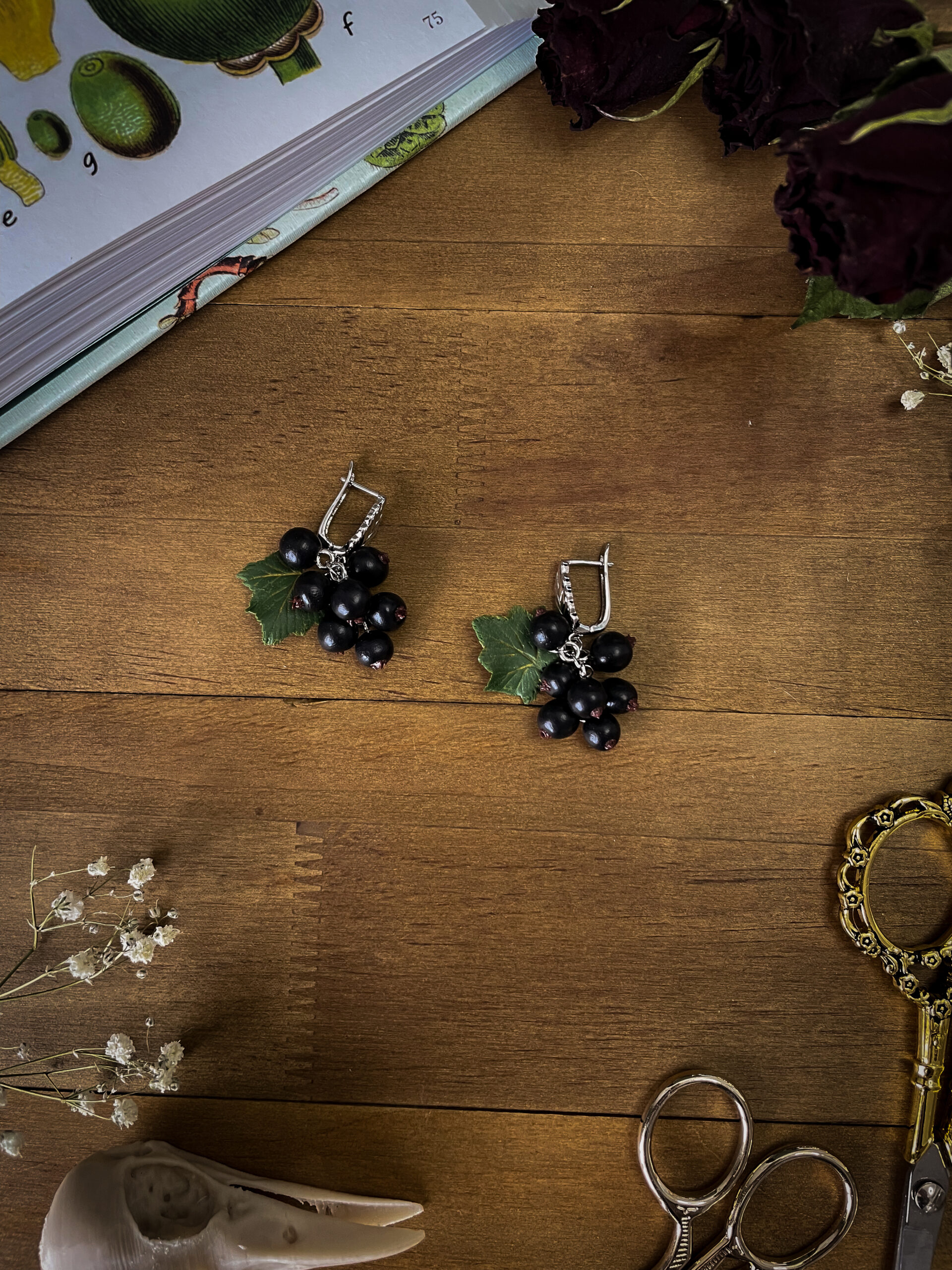 Mystical, bold, and unmistakably unique — these black currant earrings channel woodland elegance with a dark romantic edge. Handcrafted from polymer clay and arranged into full, juicy clusters, each piece is topped with deep green leaves and suspended from sculptural silver-tone leaf studs.