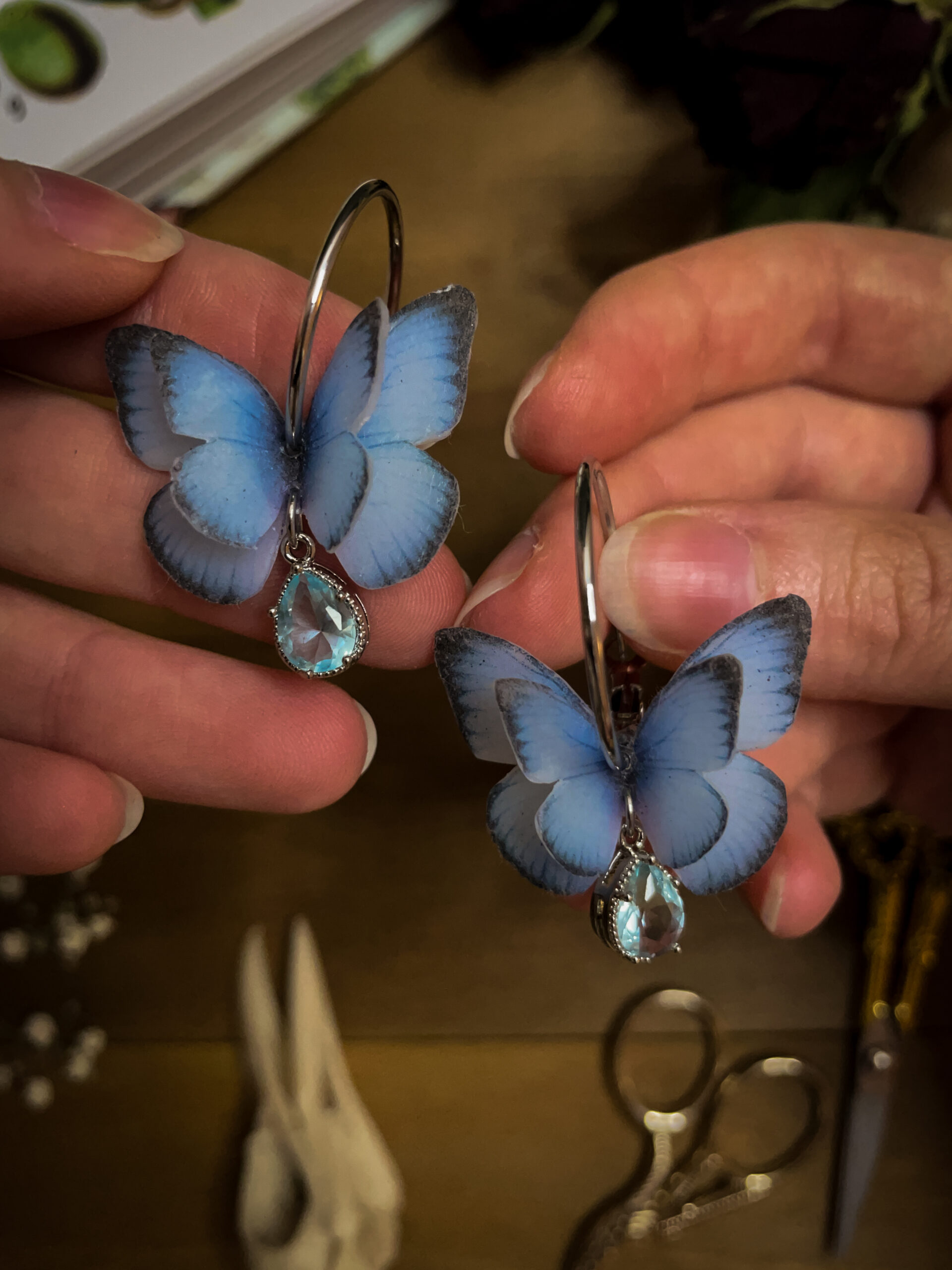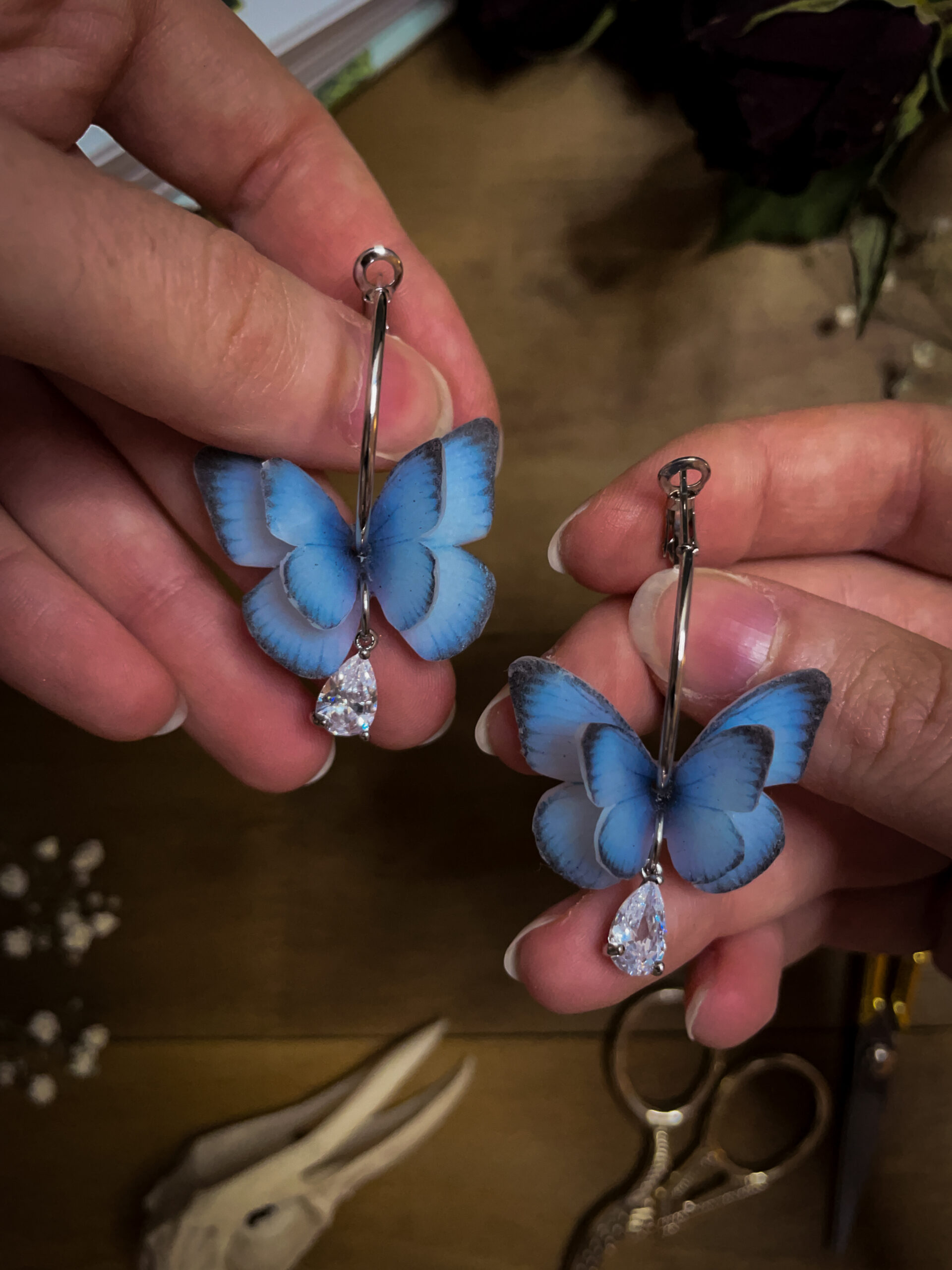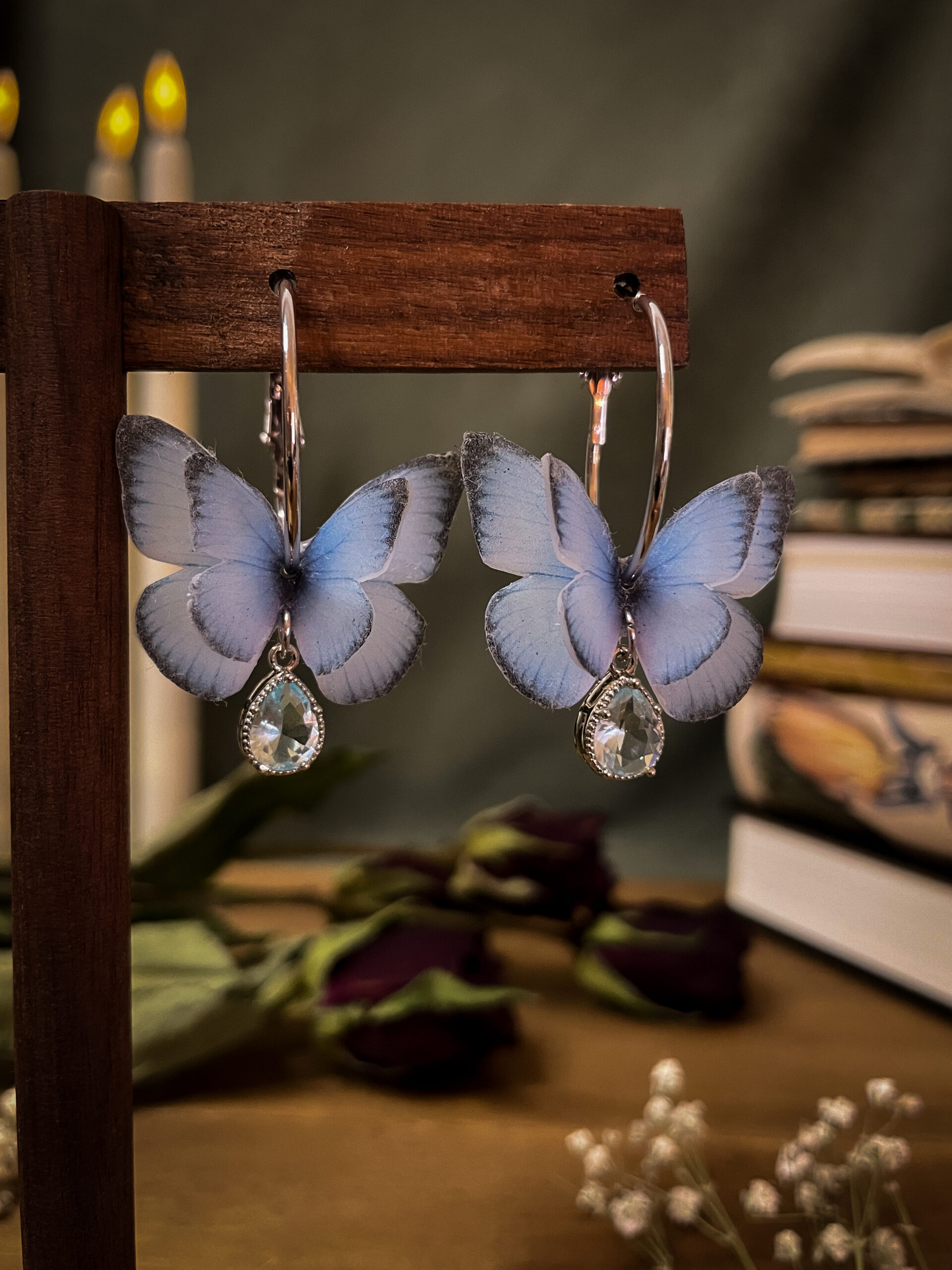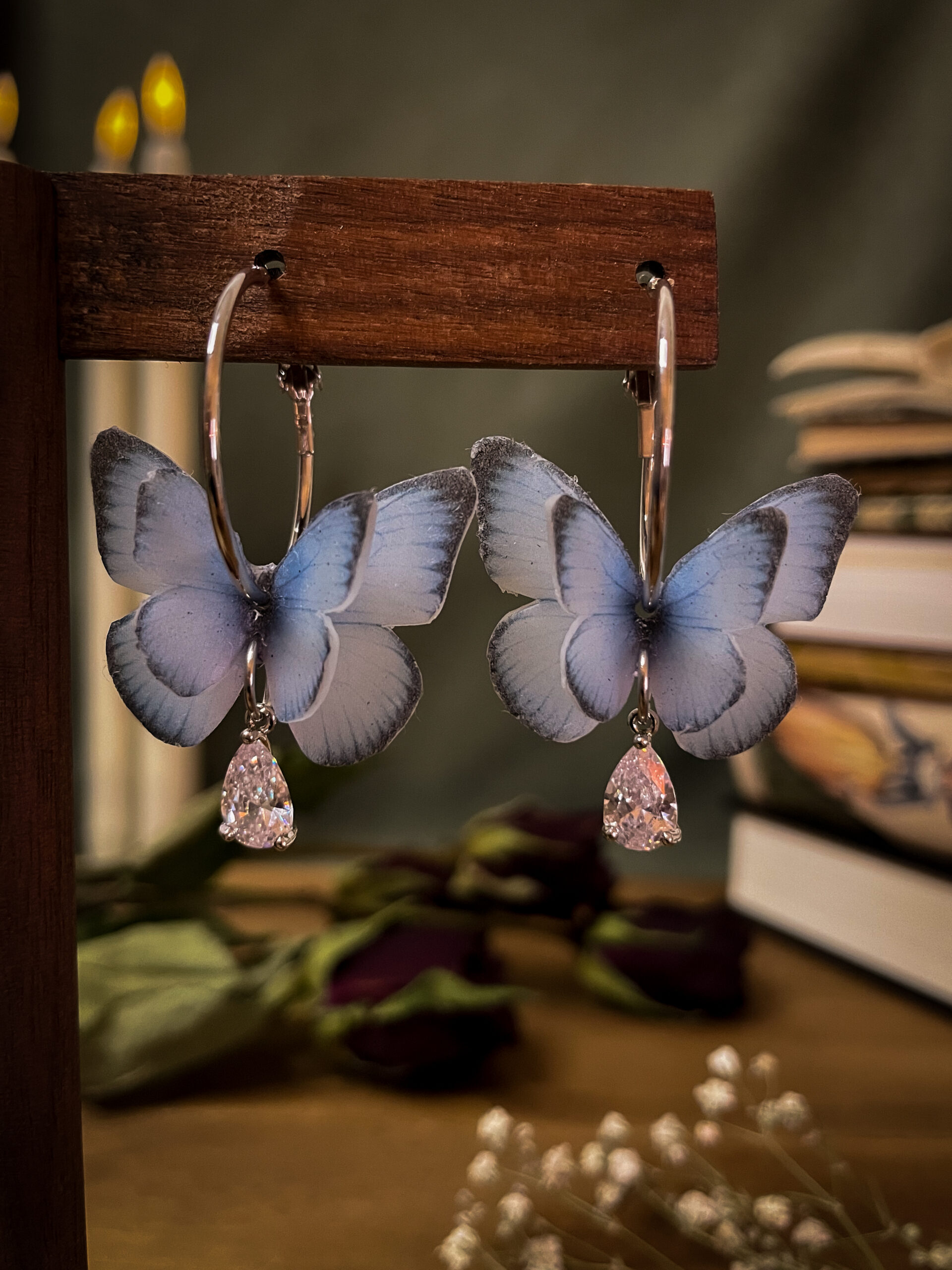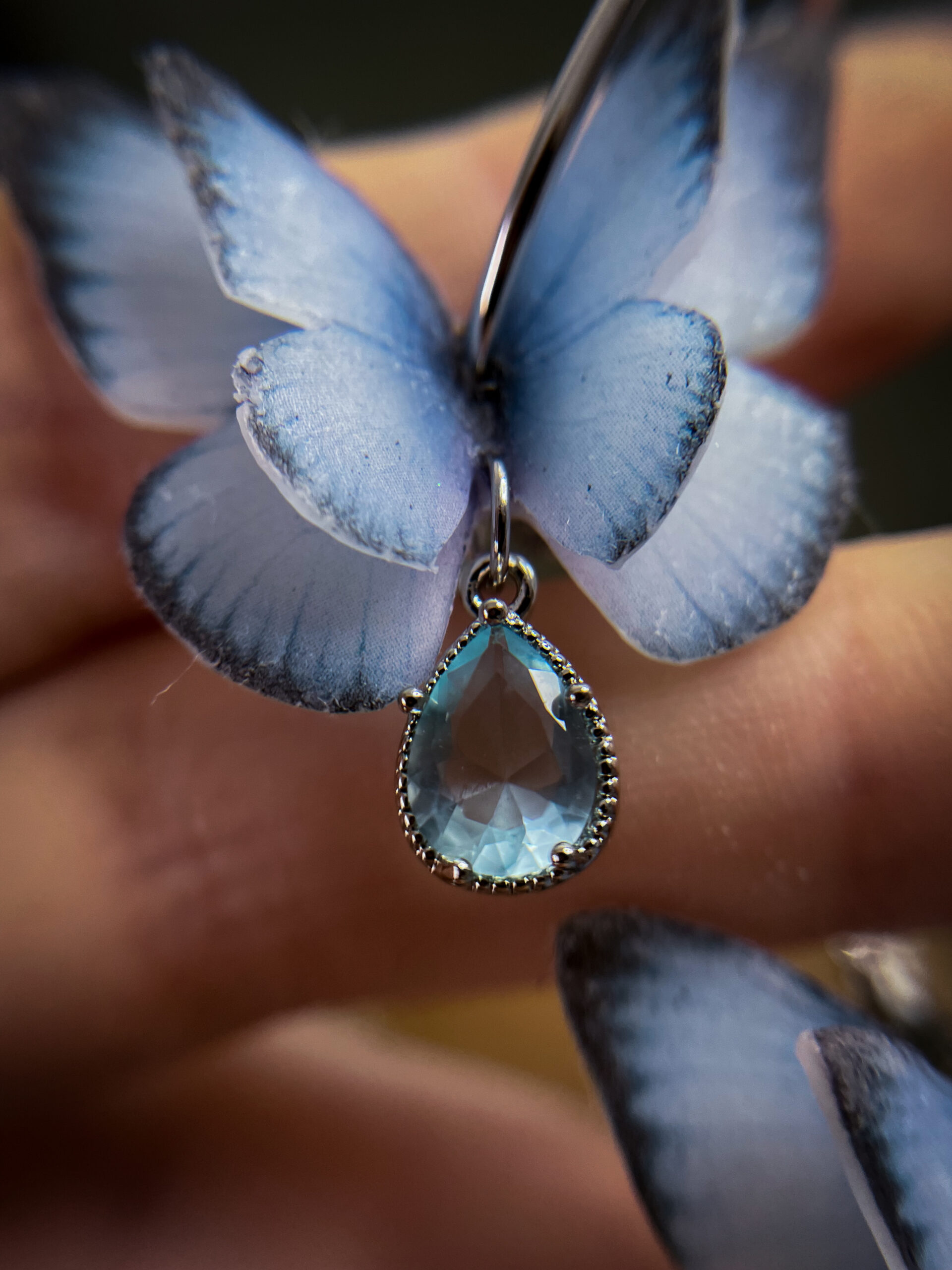 A whisper of elegance, a flutter of magic — these platinum-plated hoop earrings feature soft blue butterfly wings sculpted from polymer clay, finished with a radiant crystal teardrop that catches light like morning dew. Sophisticated and dreamy, these earrings blend fairycore fantasy with modern minimalism.