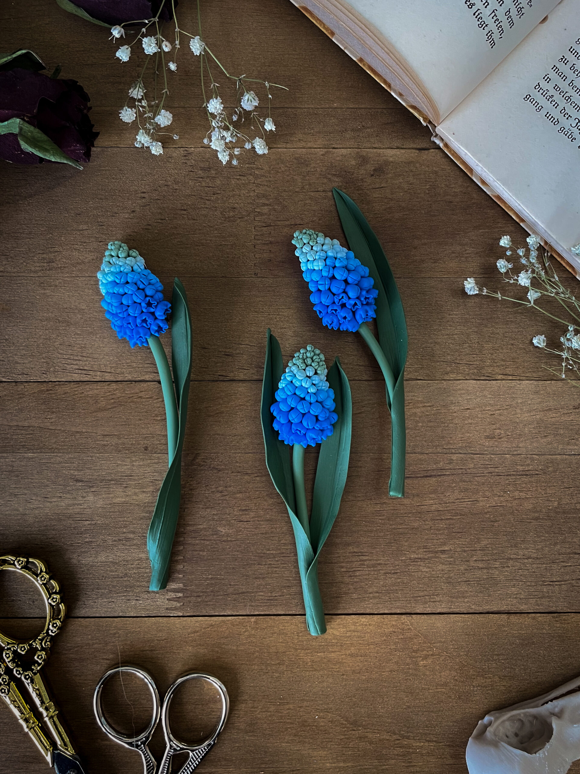 Capture the bold beauty of spring with this Bright Blue Grape Hyacinth Brooch, a vibrant accessory crafted by hand from polymer clay. Each petal and leaf is carefully sculpted to reflect the striking hues of fresh Muscari blooms, bringing garden magic to your outfit.