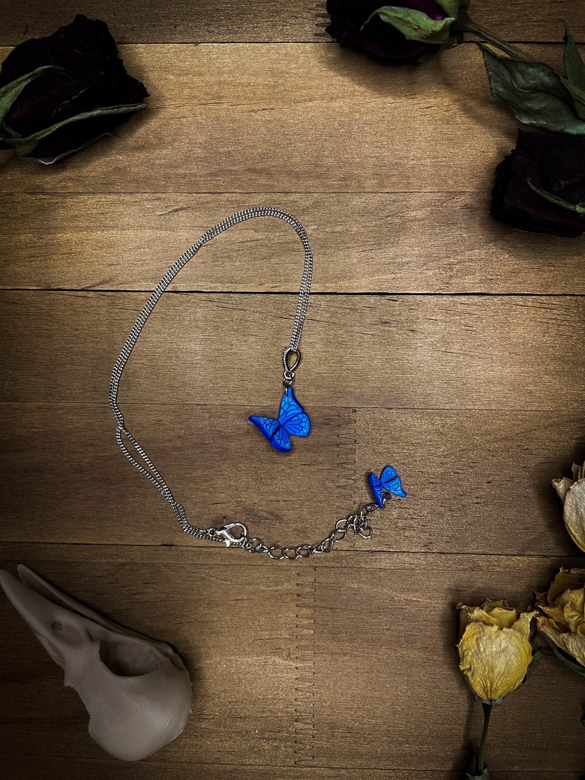 Crafted with care in Berlin, this necklace not only enhances your outfit but also serves as a reminder of the beauty that surrounds us. The vibrant blue butterflies symbolize transformation and hope, making this piece a meaningful accessory for any occasion.