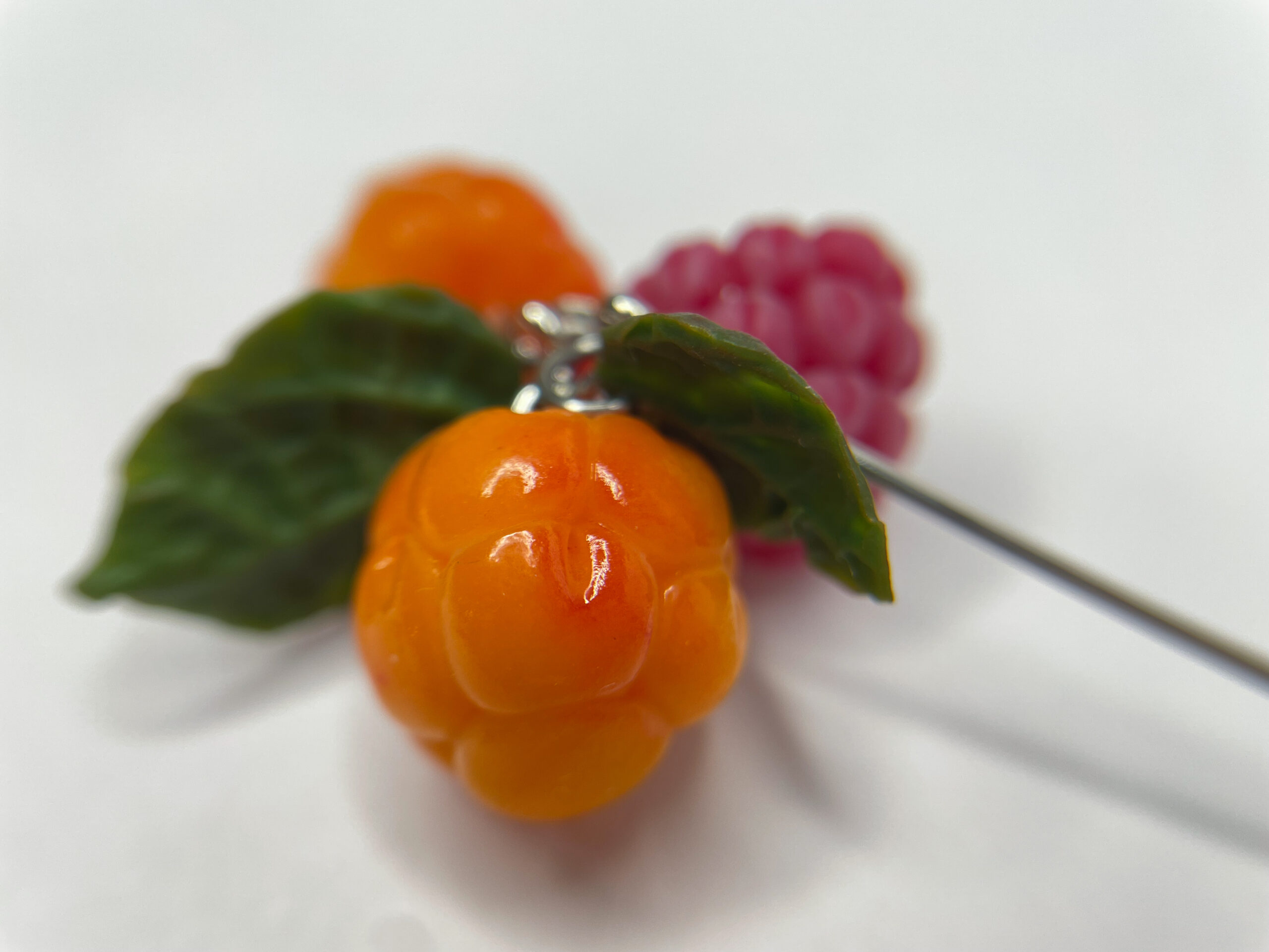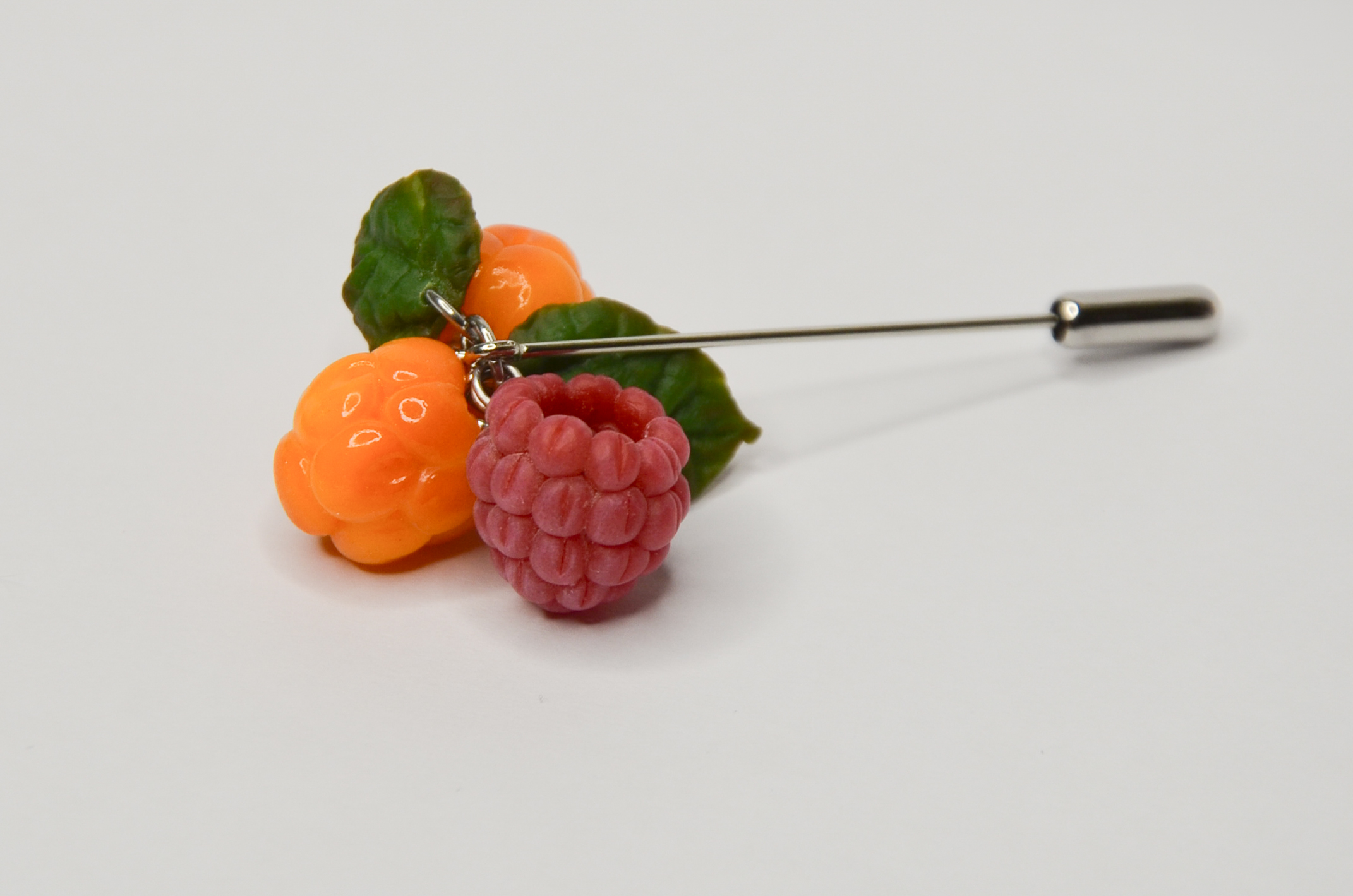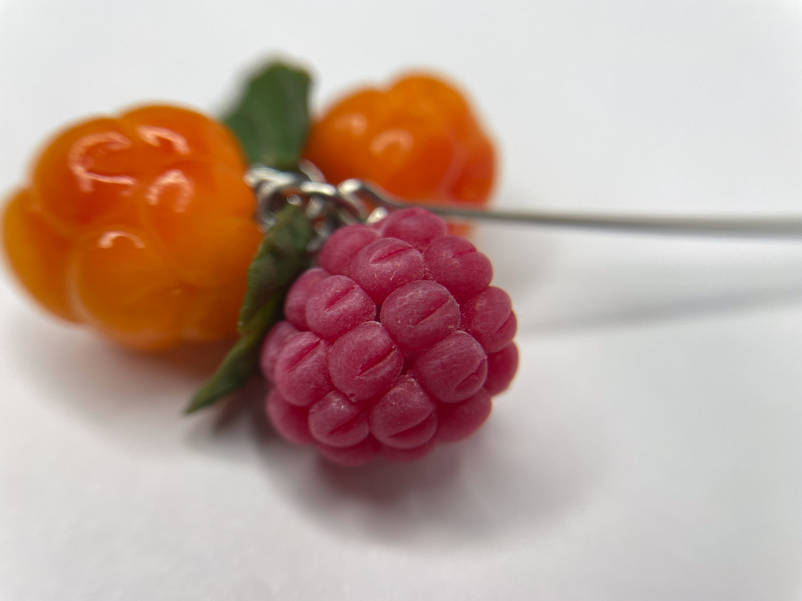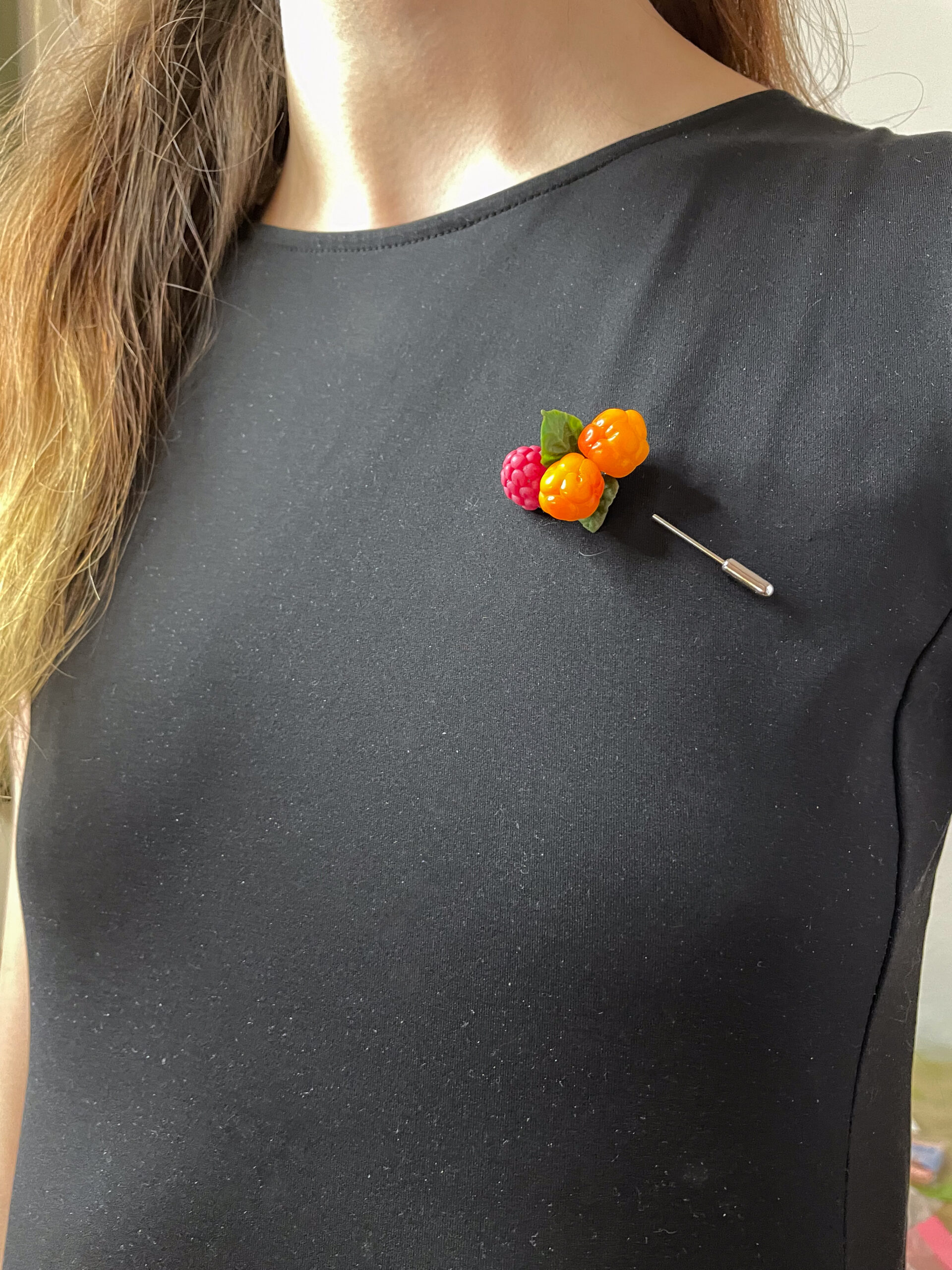 Add a unique touch to your outfit with this handmade cloudberry and raspberry brooch, inspired by the beauty of nature. Crafted from high-quality polymer clay, each berry is sculpted and painted with precision to achieve a realistic look. The warm orange of the cloudberries contrasts beautifully with the deep red raspberries, making this accessory a vibrant statement piece.