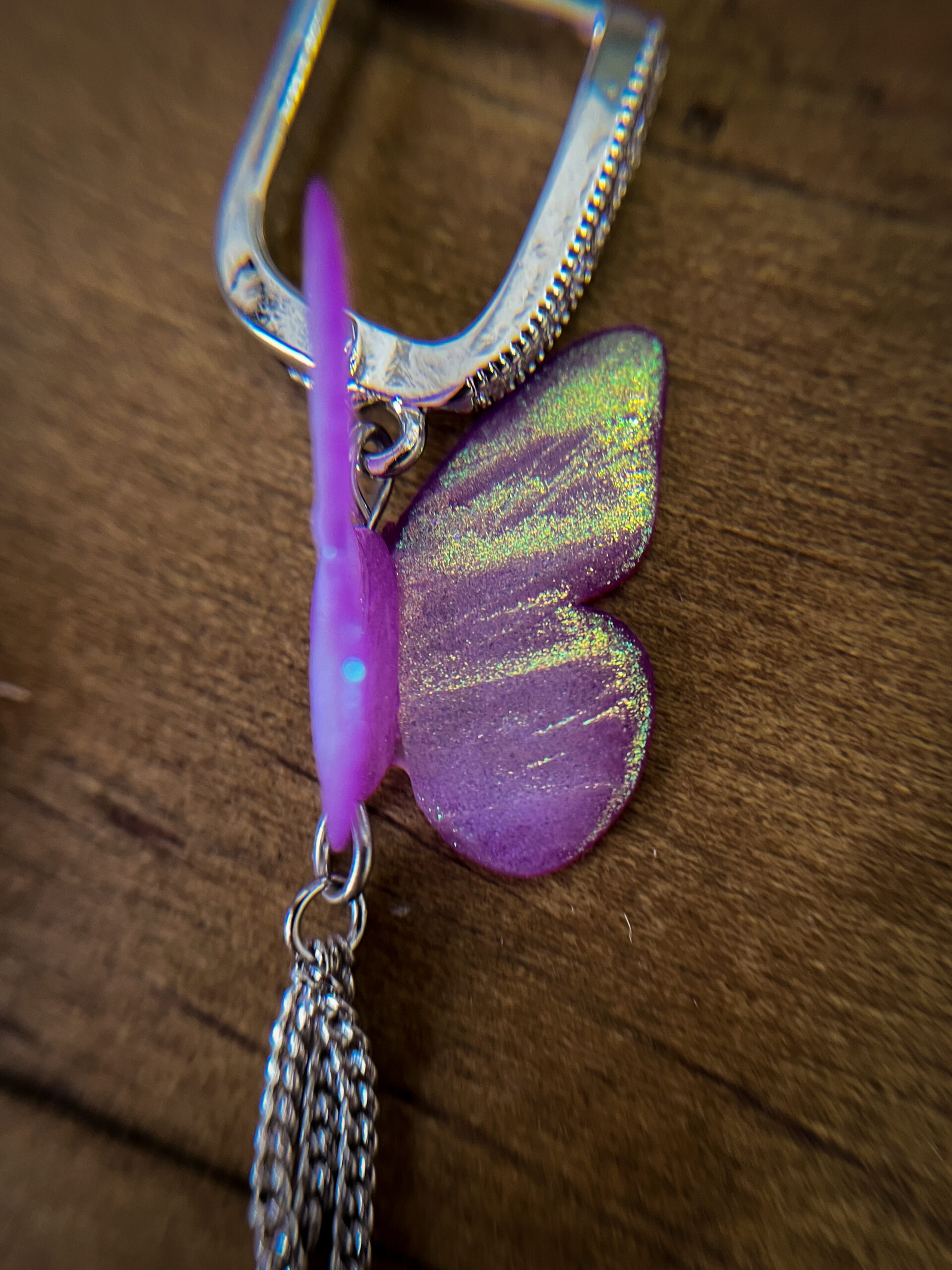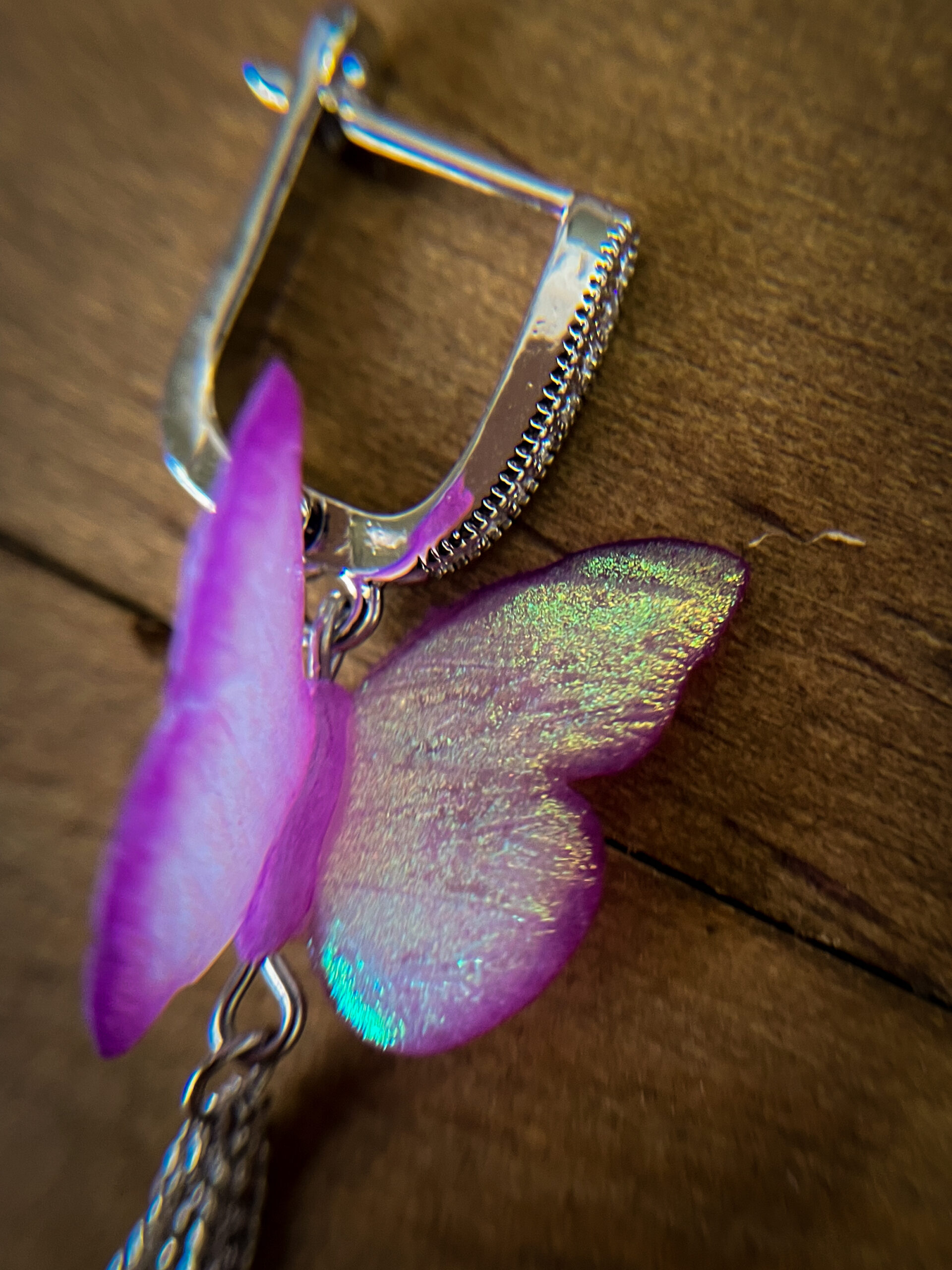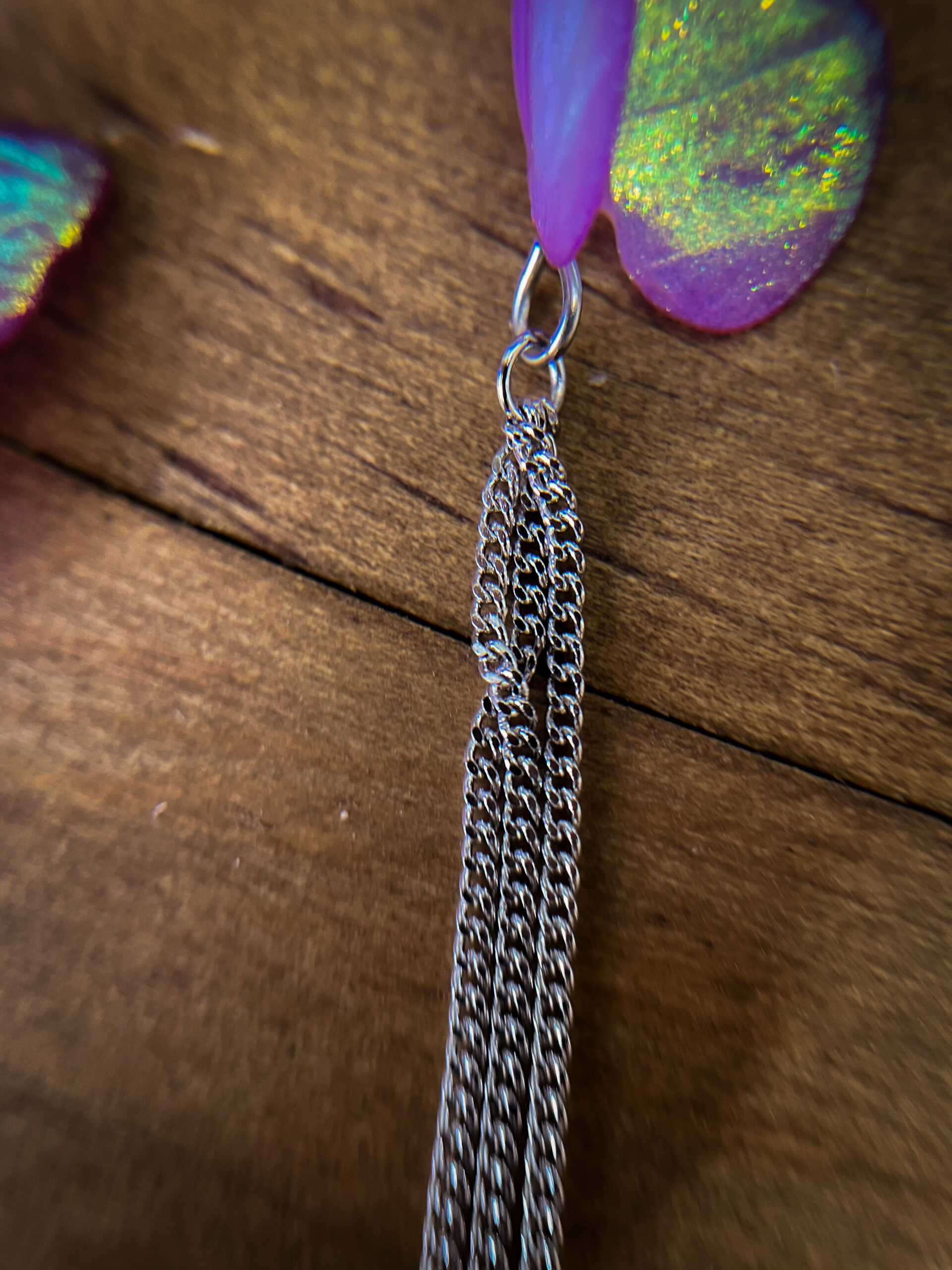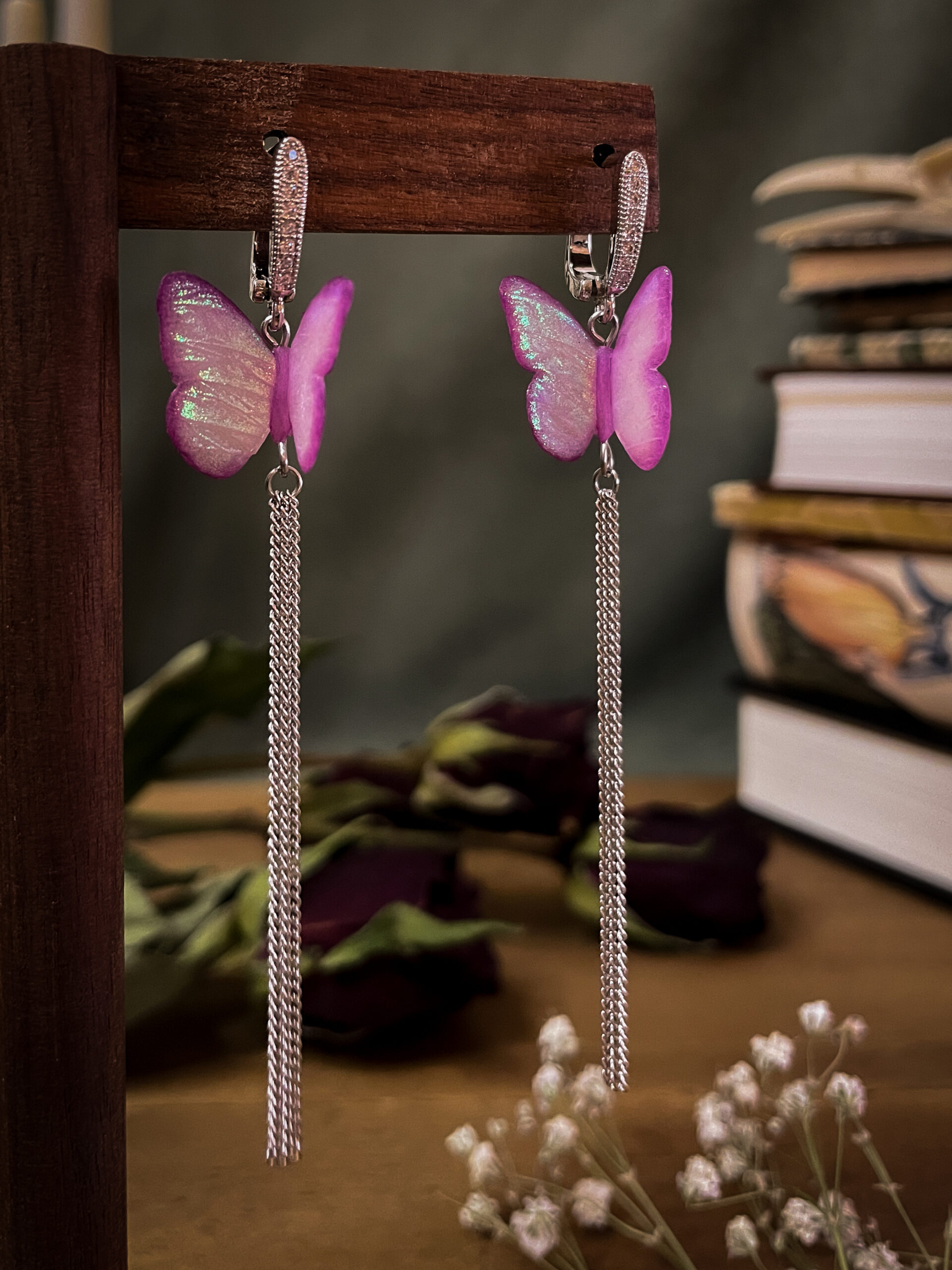 Dare to drift into the luminous — these iridescent butterfly threader earrings shimmer with every movement like light on enchanted wings. Featuring pastel pink butterflies with a holographic sheen, they’re suspended from dramatic rhodium threader chains that glide gently past the jawline.