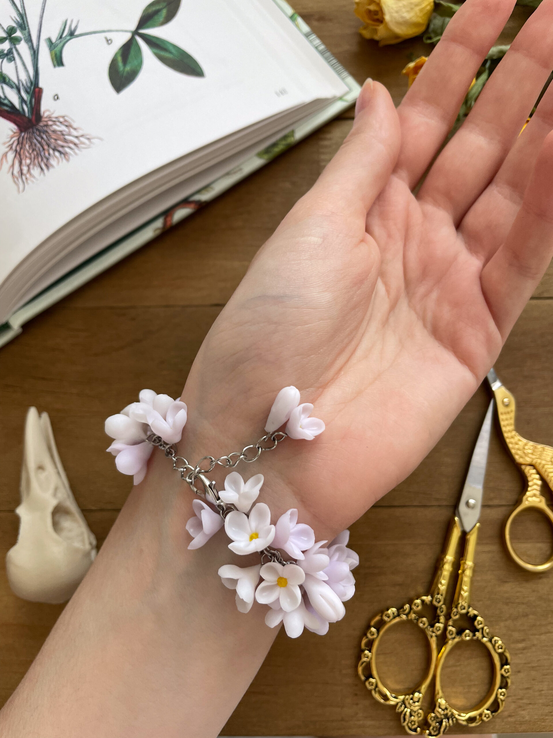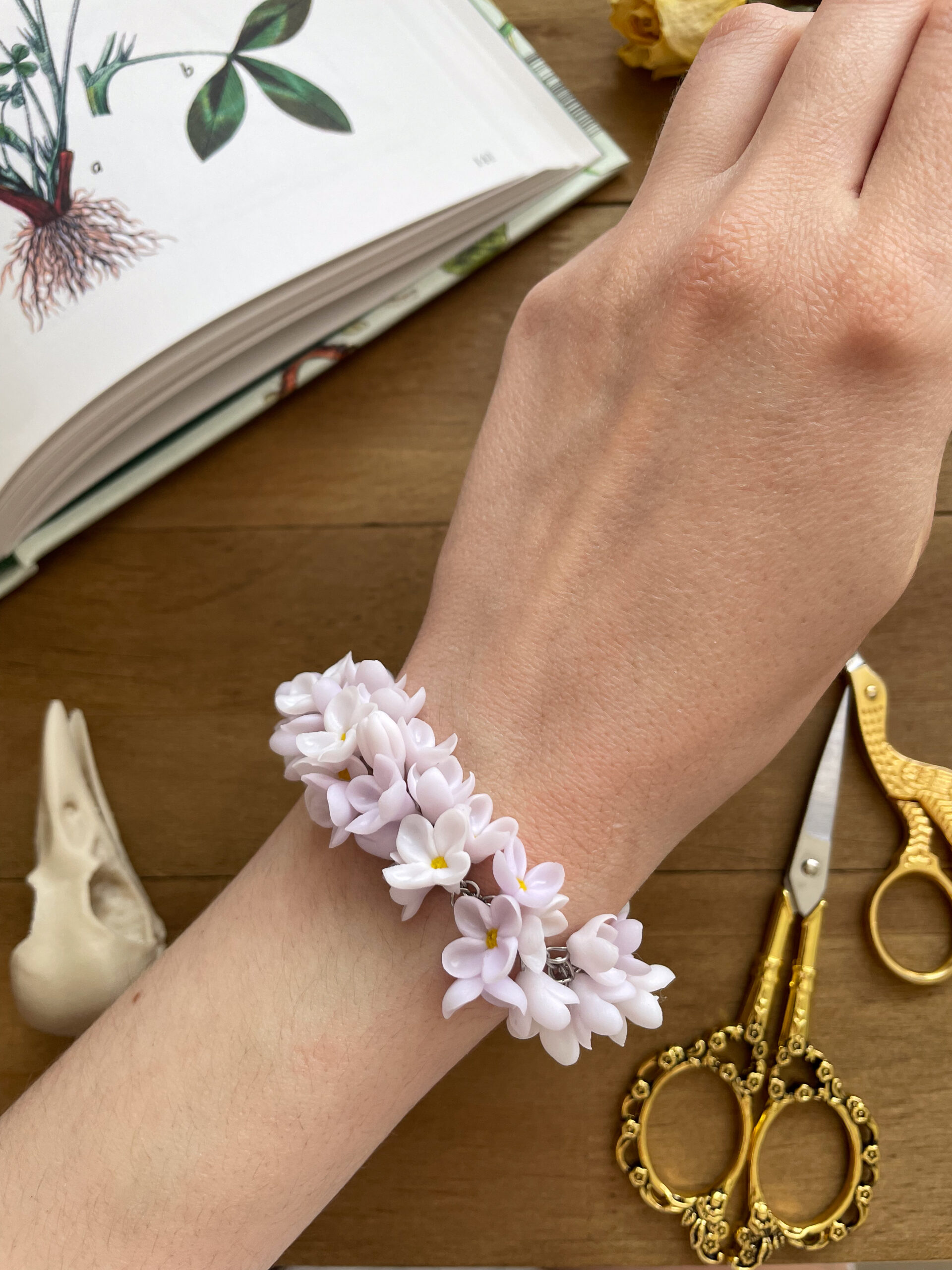 Whispering romance and springtime charm, this handmade lilac flower bracelet is a soft floral symphony crafted from polymer clay. Each bloom is delicately sculpted by hand, forming a lush and lightweight garland of pastel purple on your wrist — perfect for daydreamers, romantics, and nature lovers.