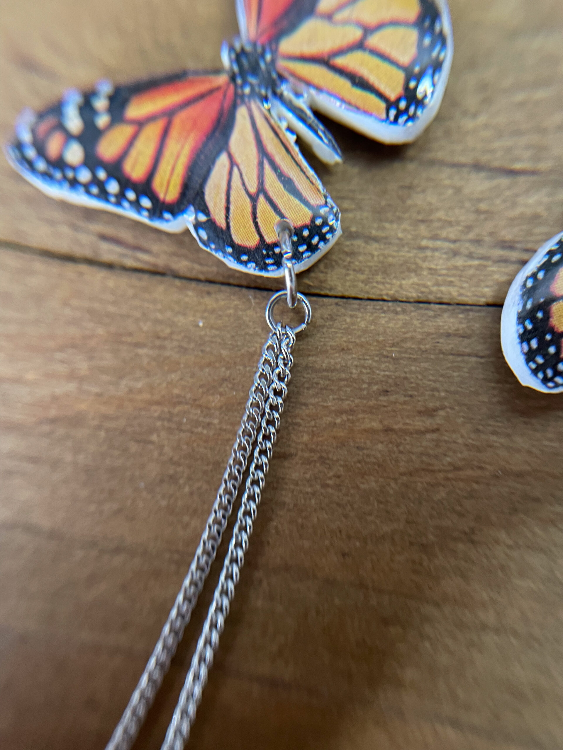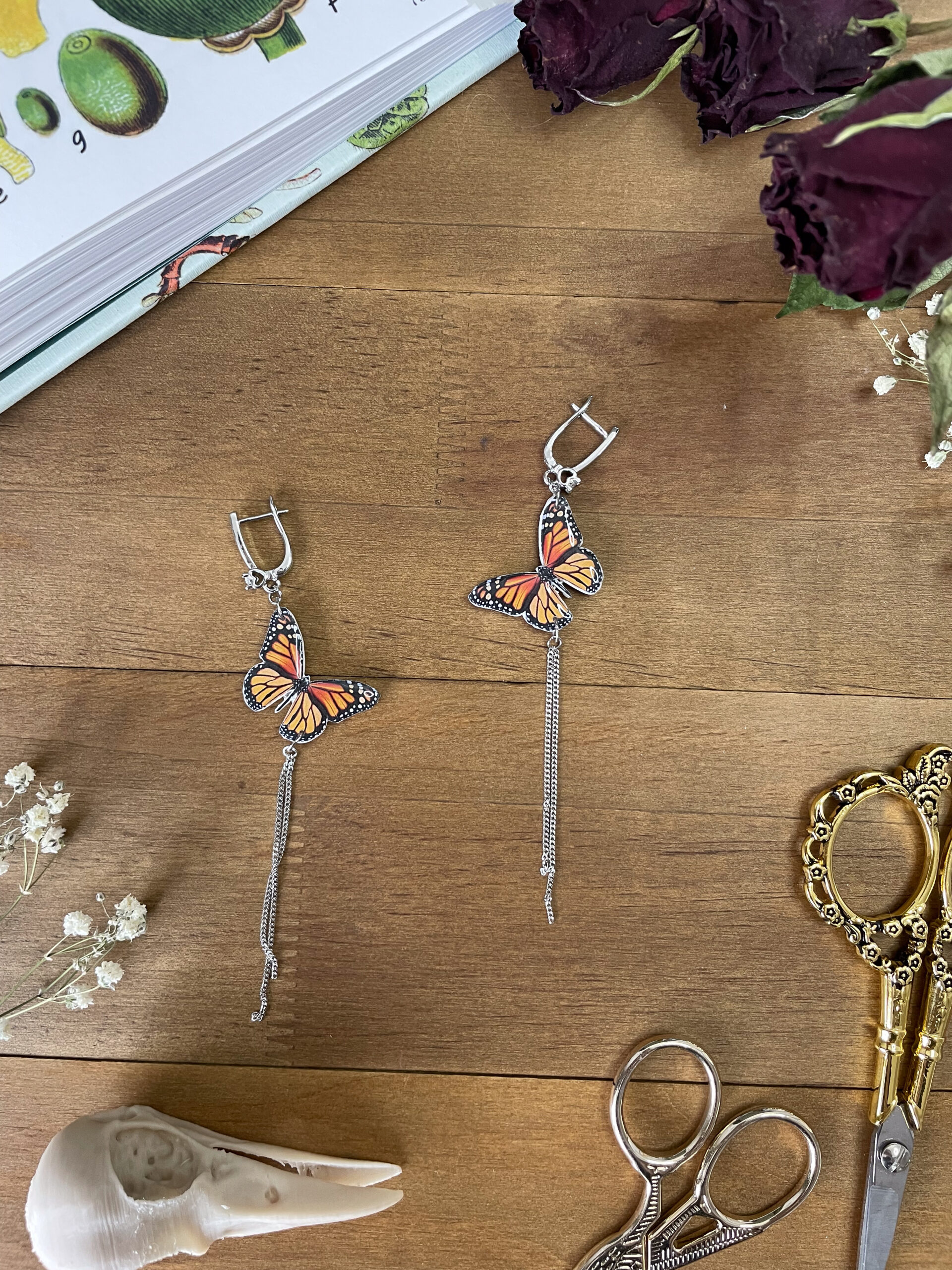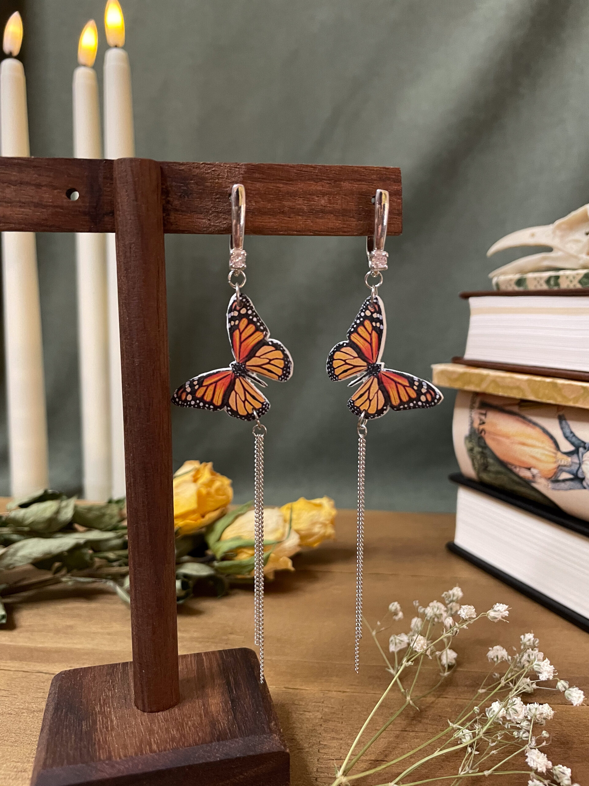 Bring the magic of transformation to your look with these ethereal monarch butterfly dangle earrings. Crafted from polymer clay and hand-finished with epoxy resin, each wing captures lifelike detail from both sides — a wearable piece of art inspired by nature’s quiet strength. The rhodium-plated hardware is hypoallergenic, lightweight, and gentle on sensitive ears.