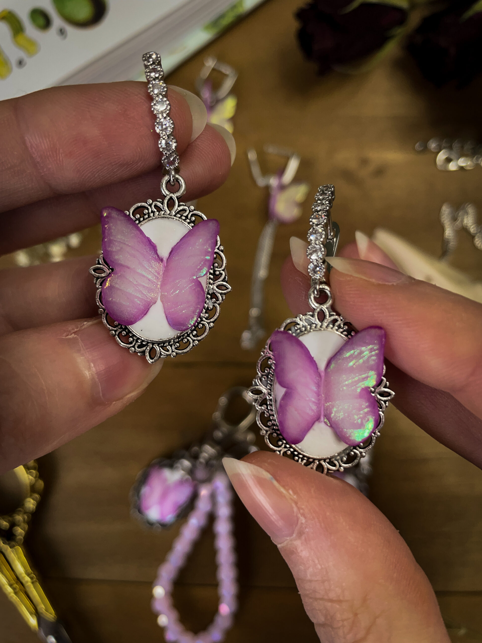 Whimsy meets vintage glamour in these pink butterfly cameo earrings — a handcrafted blend of polymer clay artistry and ornate antique-style framing. Suspended from sparkling crystal drop studs, they shimmer with quiet confidence and fairytale grace.