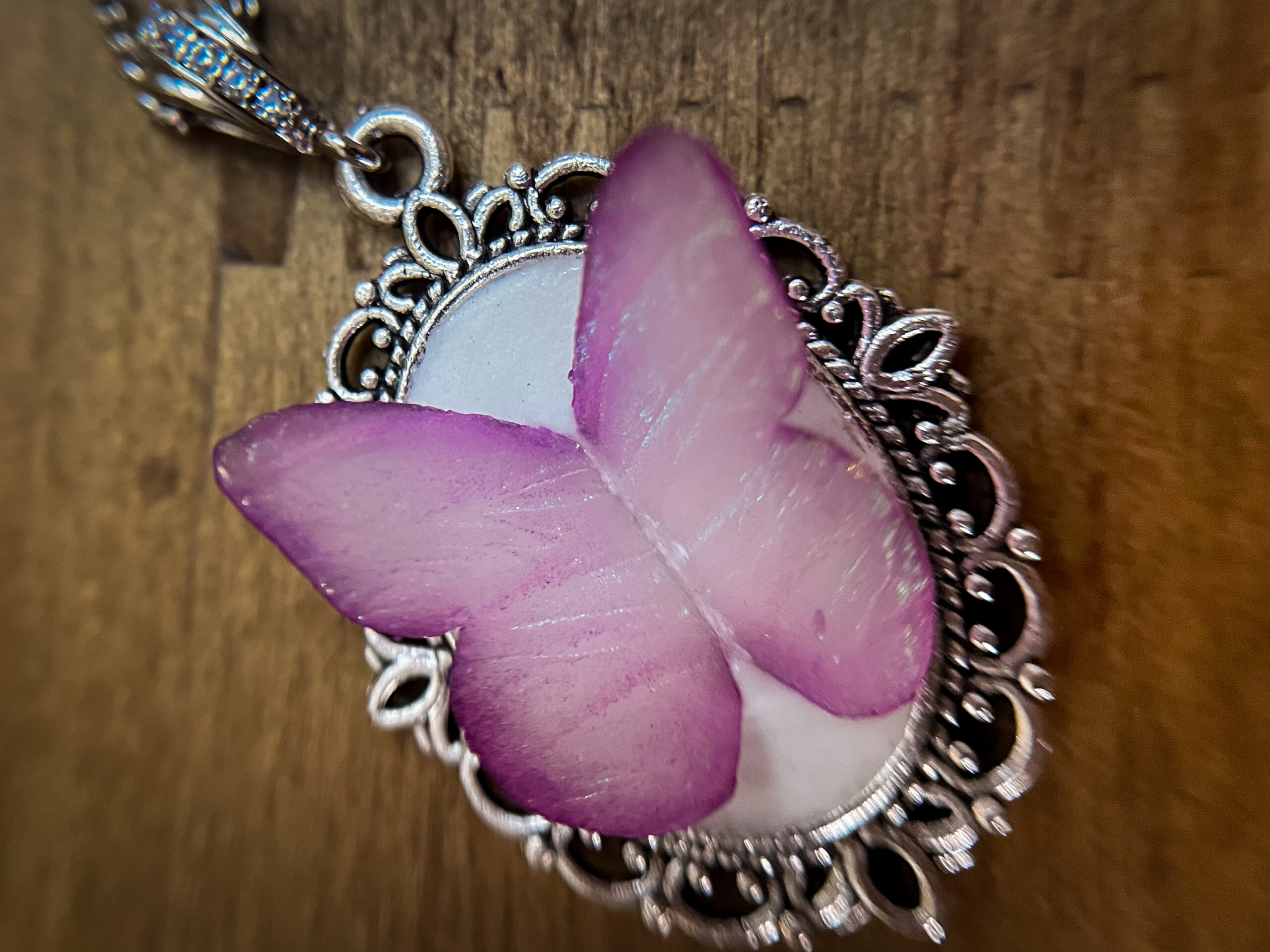 Embrace a blend of whimsy and gothic romance with this Pink Butterfly Pendant Necklace, delicately handcrafted from polymer clay. The soft pink butterfly rests in a vintage-inspired silver frame, creating an ethereal yet elegant statement that complements both dreamy and dark aesthetics.