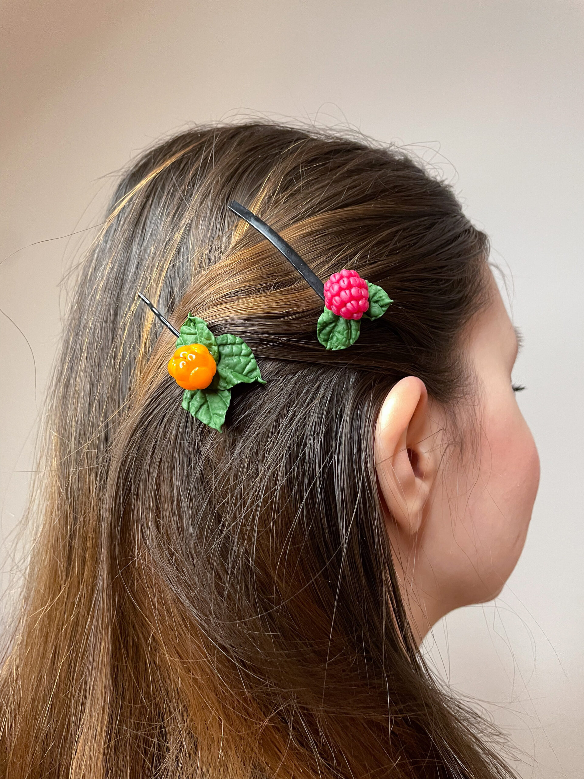 Add a touch of nature’s charm to your hairstyle with these beautifully handcrafted berry bobby pins! Inspired by the delicate beauty of raspberries and cloudberries, these unique hair accessories are perfect for everyday wear or special occasions.