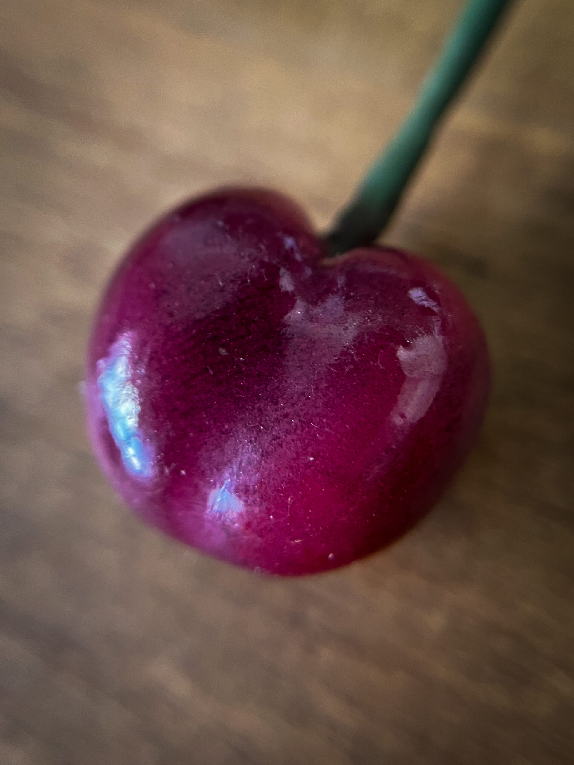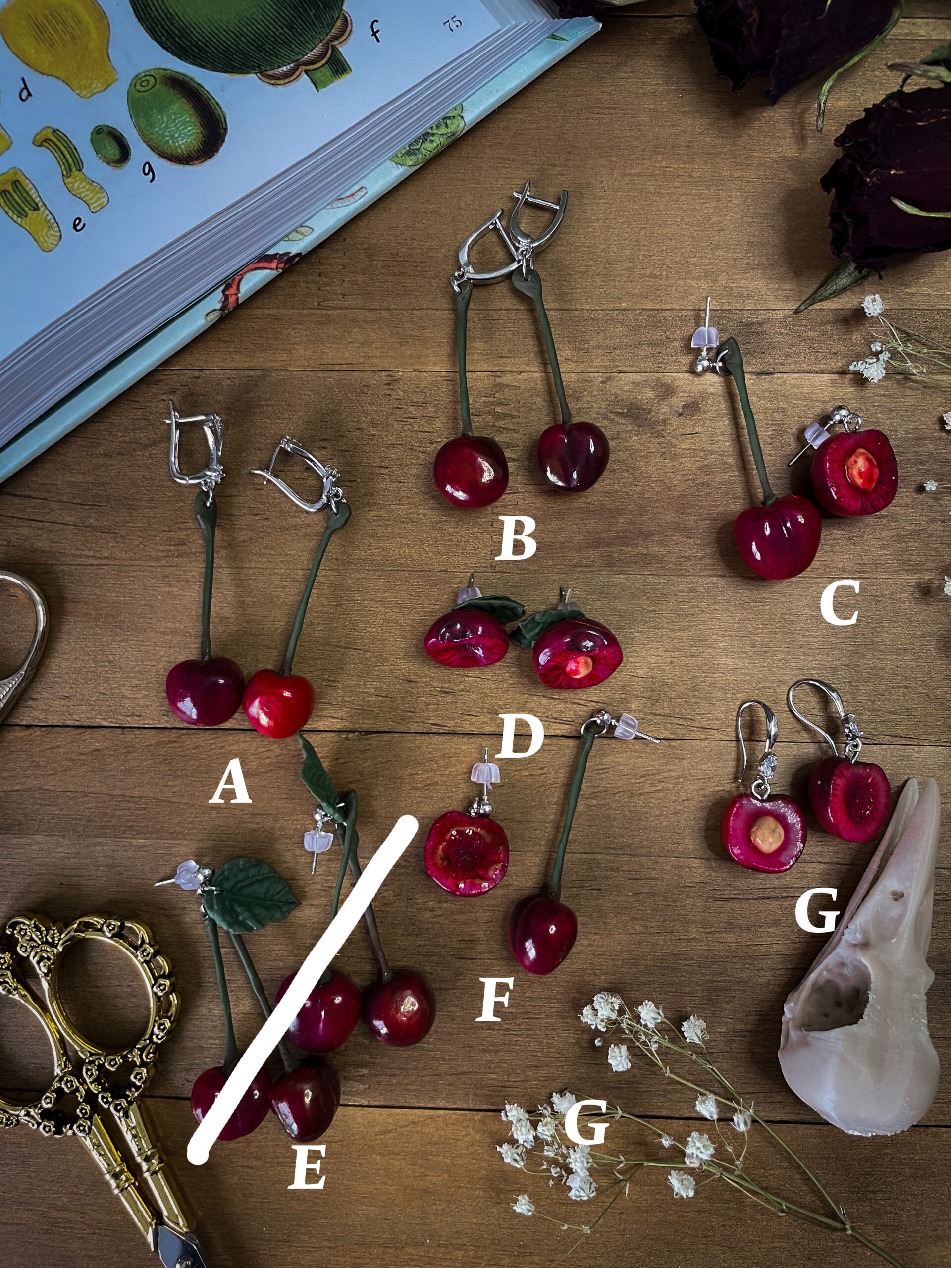 Sleek, juicy, and surprisingly sophisticated — these minimalist cherry earrings feature lifelike fruit drops on slender green stems. Each pair is handcrafted from polymer clay and sealed with a high-shine top coat, creating a perfect blend of natural whimsy and sculptural elegance.