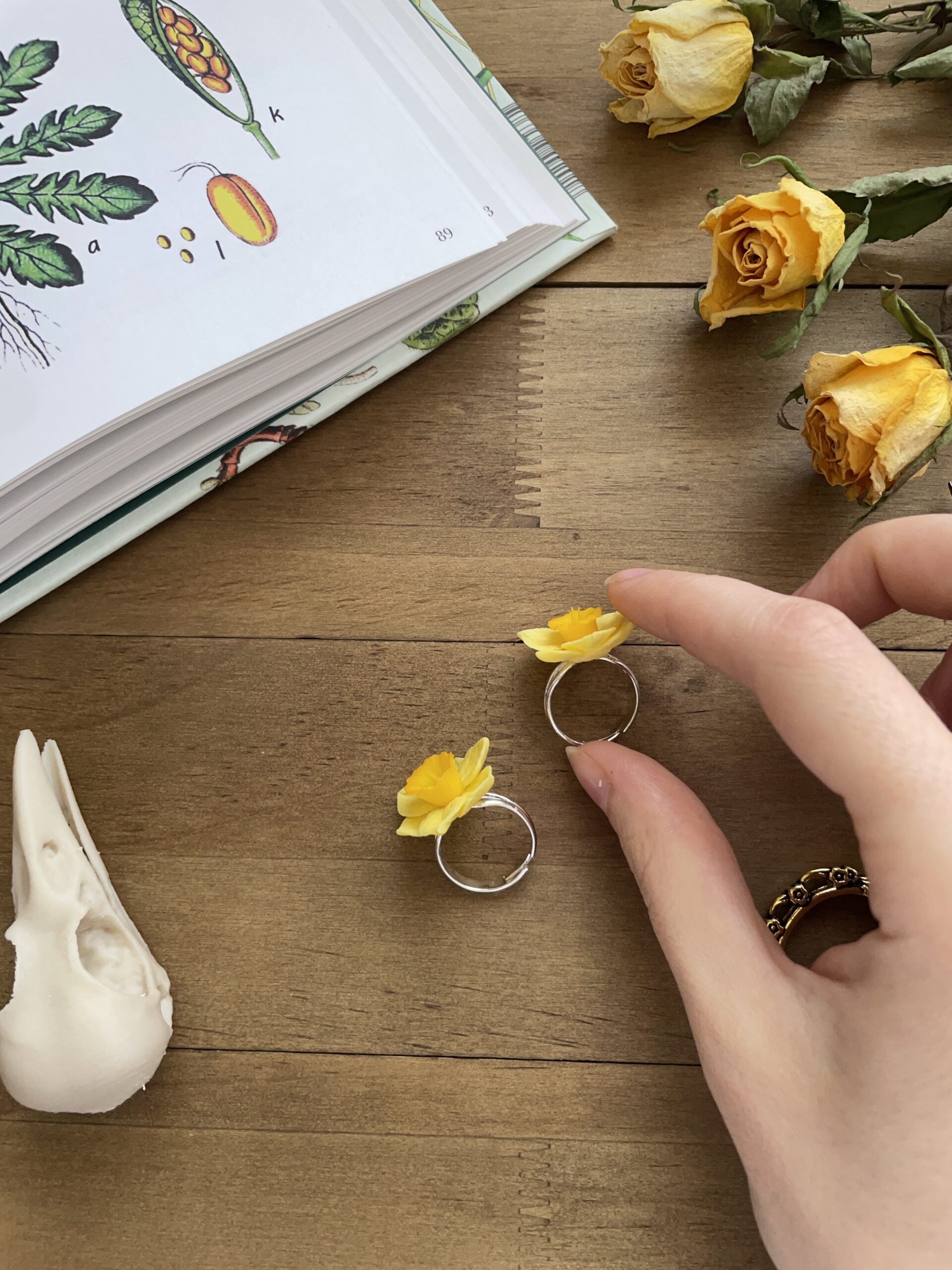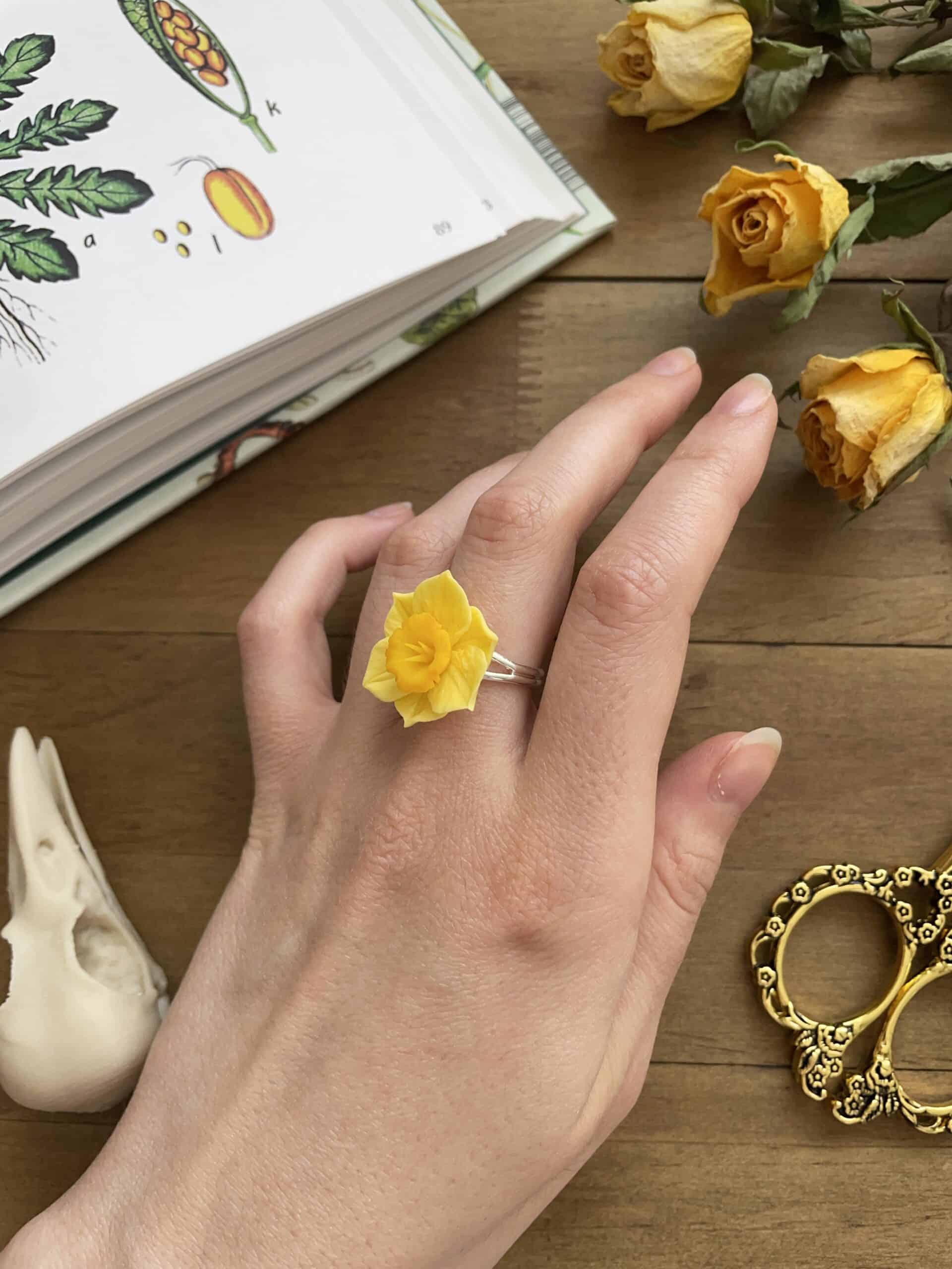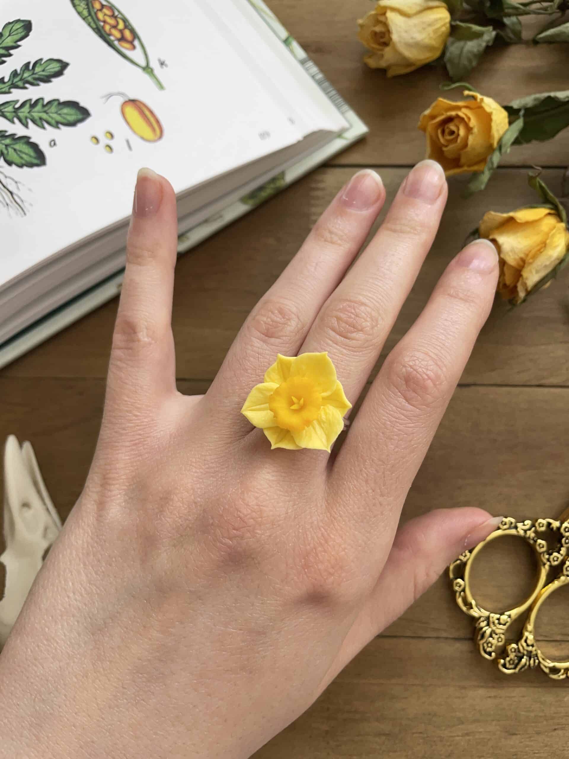 Let your fingers bloom with this enchanting yellow narcissus ring — a wearable sculpture of sunshine crafted in fine polymer clay. This lifelike daffodil is a symbol of renewal and radiant self-expression, perfect for the dreamer, gardener, or flower lover in your life.